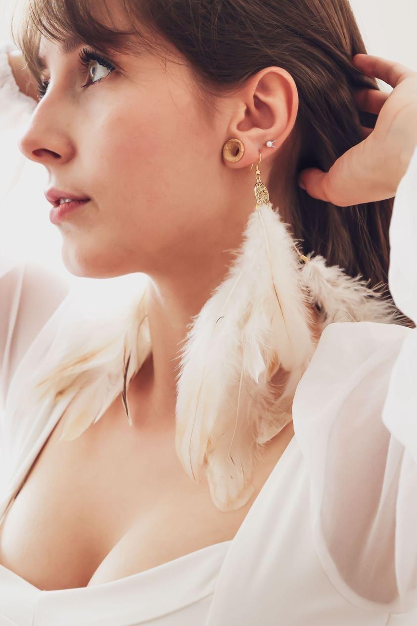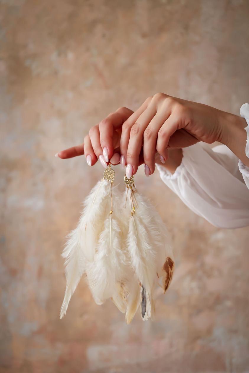 Pozwól, aby te kolczyki z piór wprowadziły Cię w przestrzeń lekkości, pewności siebie i subtelnej magii.