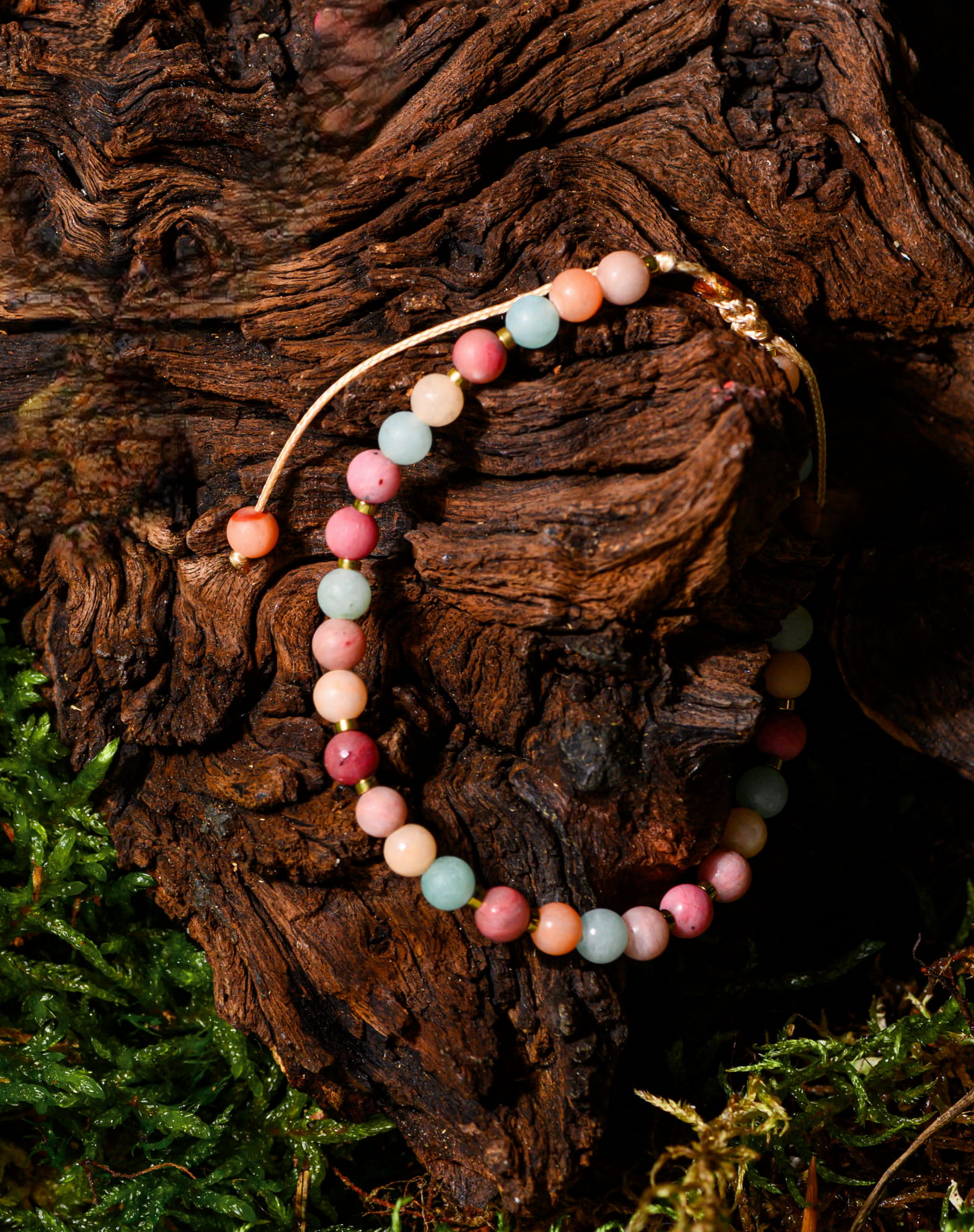 Balans Duszy łączy Awenturyn Brzoskwiniowy, Rodonit i Amazonit. Awenturyn wnosi radość i optymizm, Rodonit uzdrawia serce i wspiera emocjonalną odwagę, a Amazonit wprowadza spokój i harmonizuje emocje. Tworzą mistyczną aurę równowagi emocjonalnej, wewnętrznego spokoju i pozytywnej energii. Nazwa „Balans Duszy” oddaje przewodnictwo biżuterii w drodze do harmonii ciała, serca i duszy.