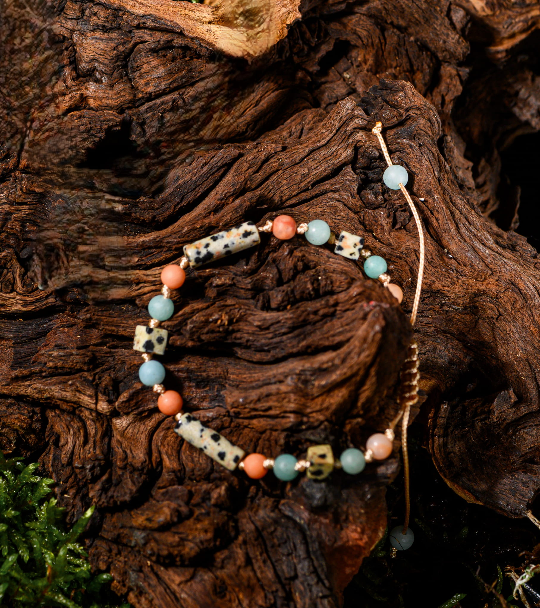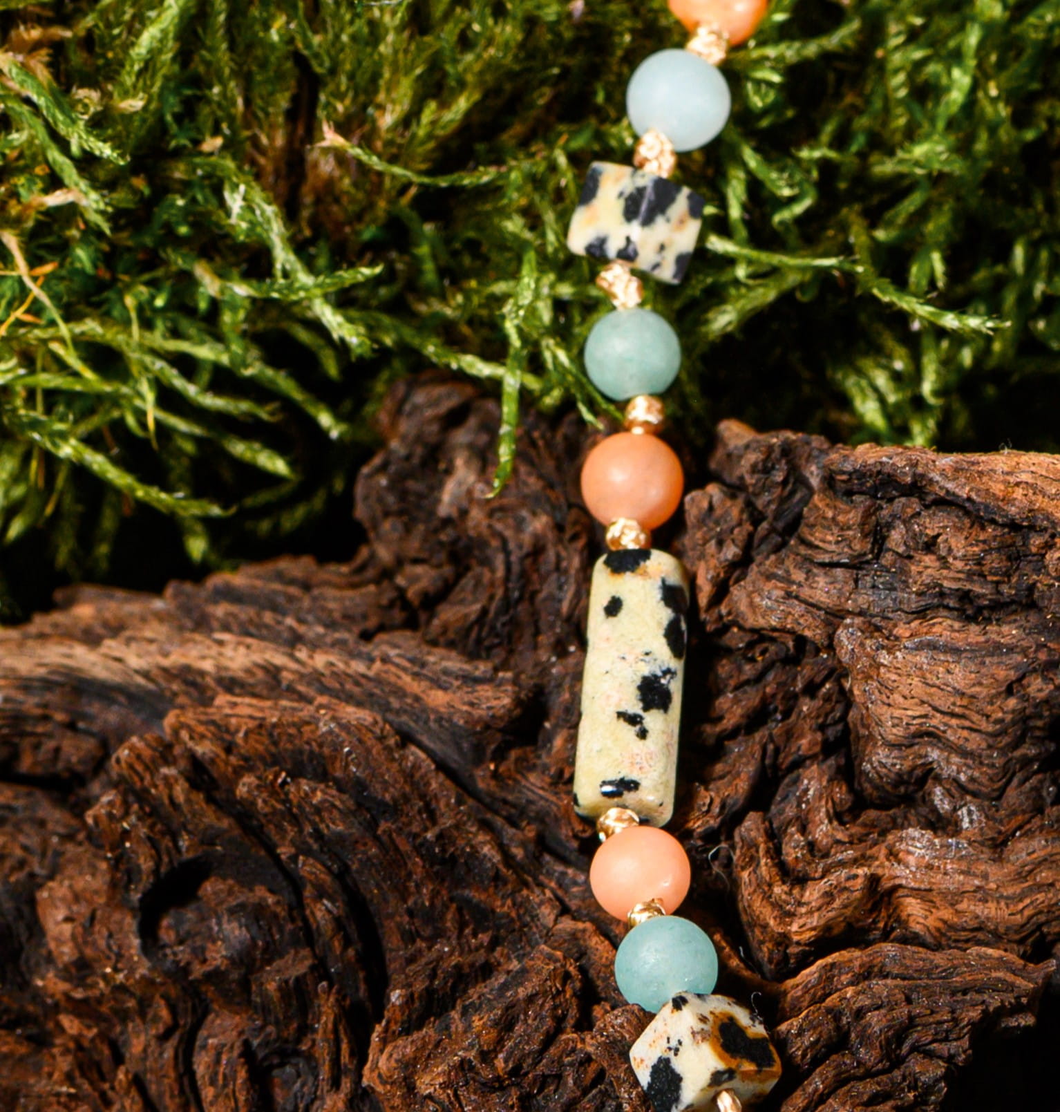 Get What You Need to biżuteria z jaspisu dalmatyńskiego, awenturynu brzoskwiniowego i amazonitu, uzupełniona zawieszką Luna z jaspisu dalmatyńskiego. Jaspis wnosi radość i subtelną ochronę, awenturyn brzoskwiniowy wprowadza optymizm i wewnętrzną równowagę, a amazonit wspiera spokój i klarowność myśli. Razem tworzą energetyczny przewodnik, który pomaga podejmować świadome decyzje i przyciągać to, czego naprawdę potrzebujesz. To biżuteria pełna symboliki i subtelnej mocy, idealna do codziennego życia.