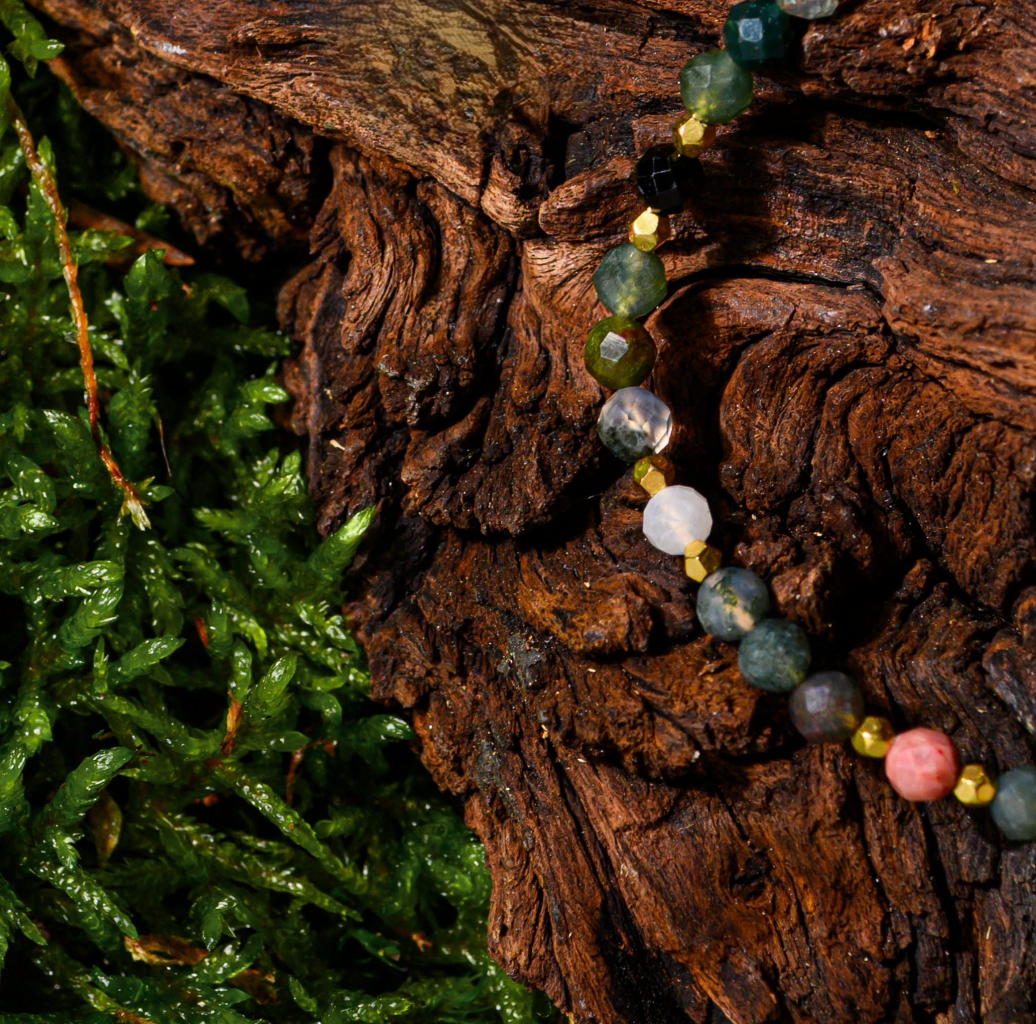 W sercu porannego lasu, tam gdzie cisza splata się z oddechem ziemi, narodziła się Leśna Mgła. Agat indyjski uziemia i przynosi harmonię, rodonit otwiera serce na miłość i uzdrawia emocje. Turmalin tworzy ochronną tarczę przed negatywną energią, a kamień księżycowy rozświetla intuicję i wprowadza spokój.