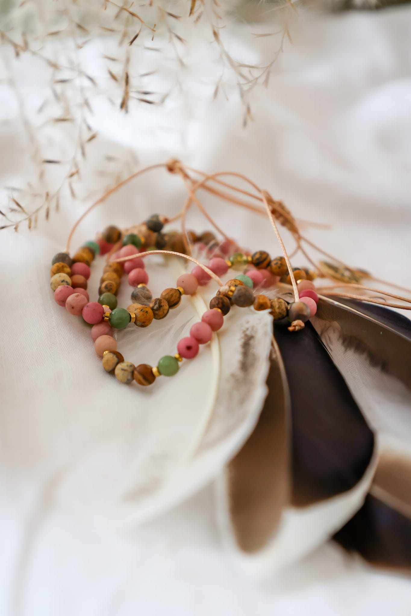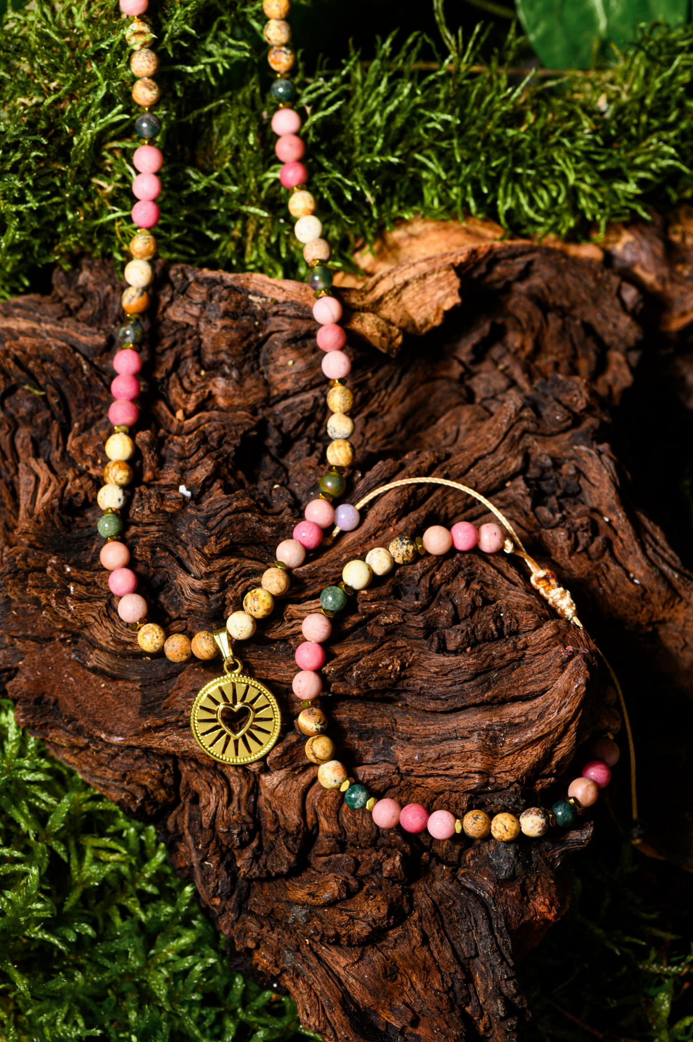 Dusza Natury to biżuteria z Rodonitu, Jaspisu Obrazkowego i Agatu Indyjskiego. Rodonit otwiera serce i uzdrawia emocje, Jaspis wnosi stabilność i mądrość, a Agat wprowadza spokój i harmonię. Tworzą subtelną aurę, która łączy z naturą, własnym wnętrzem i otoczeniem. Nosząc „Duszę Natury”, wprowadzasz równowagę, spokój i wewnętrzną siłę, pozwalając sercu i duszy współgrać w harmonii z otoczeniem.