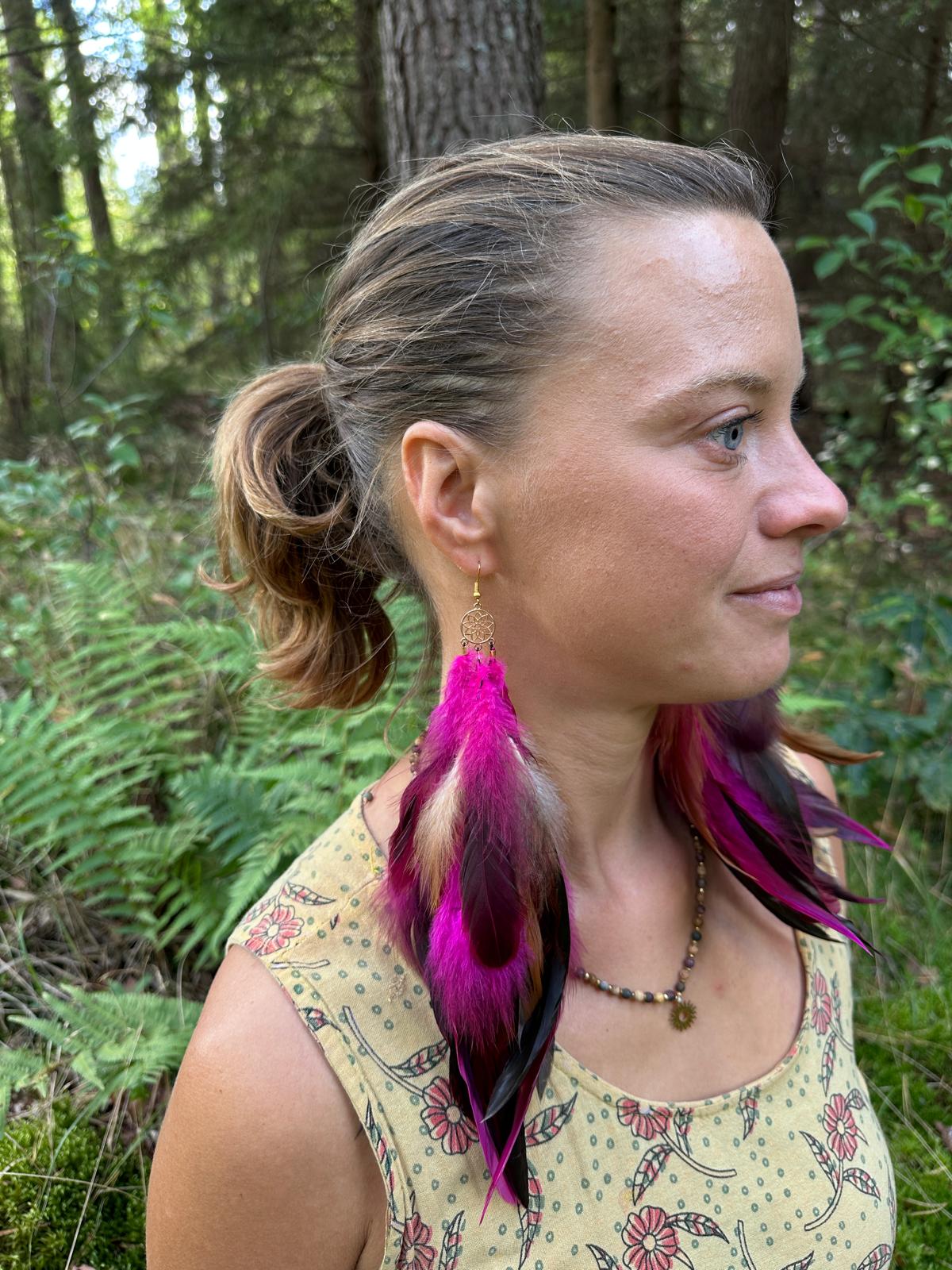 Limitowane Kolczyki z piór "Skrzydła Bogini" Efektowna długość (długie) ciemny róż z brązem