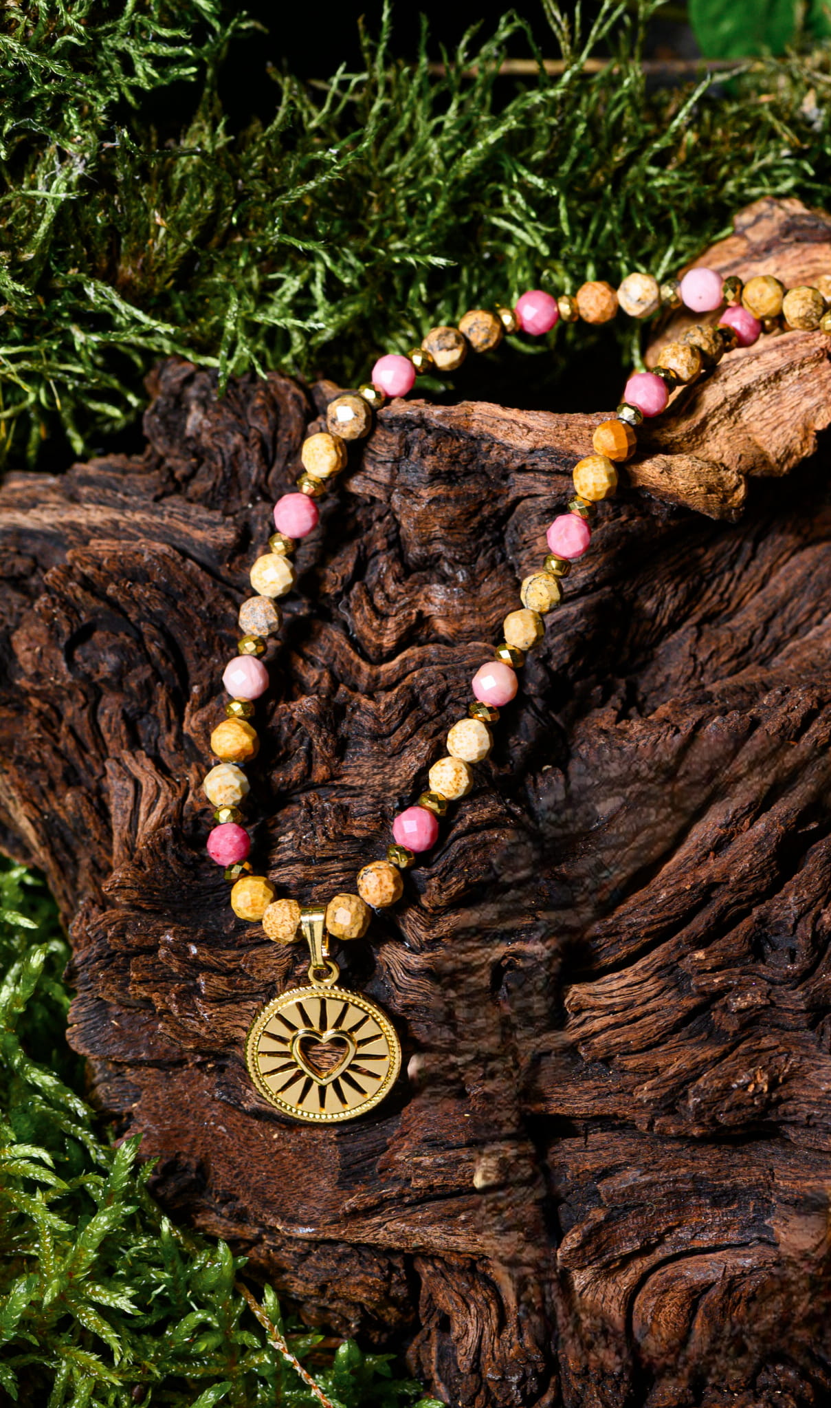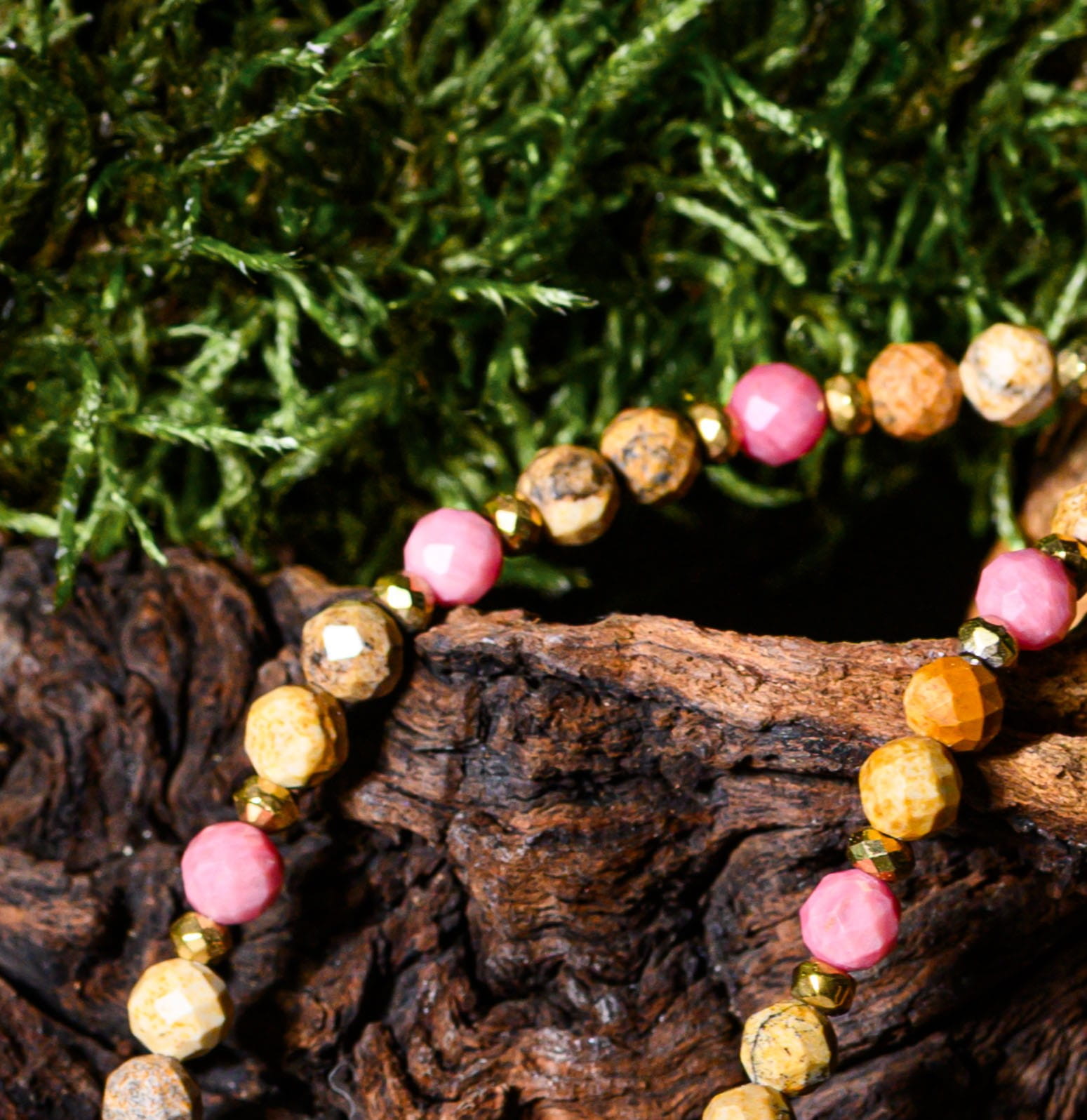 Pustynna Róża to biżuteria z jaspisu obrazkowego i Rodonitu, harmonizująca siłę ziemi z mocą serca. Jaspis obrazkowy symbolizuje mądrość, stabilność i ugruntowanie, a Rodonit wnosi ciepło, uzdrawia emocje i wspiera miłość do siebie oraz innych. Razem tworzą subtelną aurę przewodnika, przypominającą, że nawet w trudnych chwilach można odnaleźć piękno, spokój i siłę serca. Nazwa „Pustynna Róża” odzwierciedla równowagę między wytrwałością a delikatnym rozkwitem uczuć.