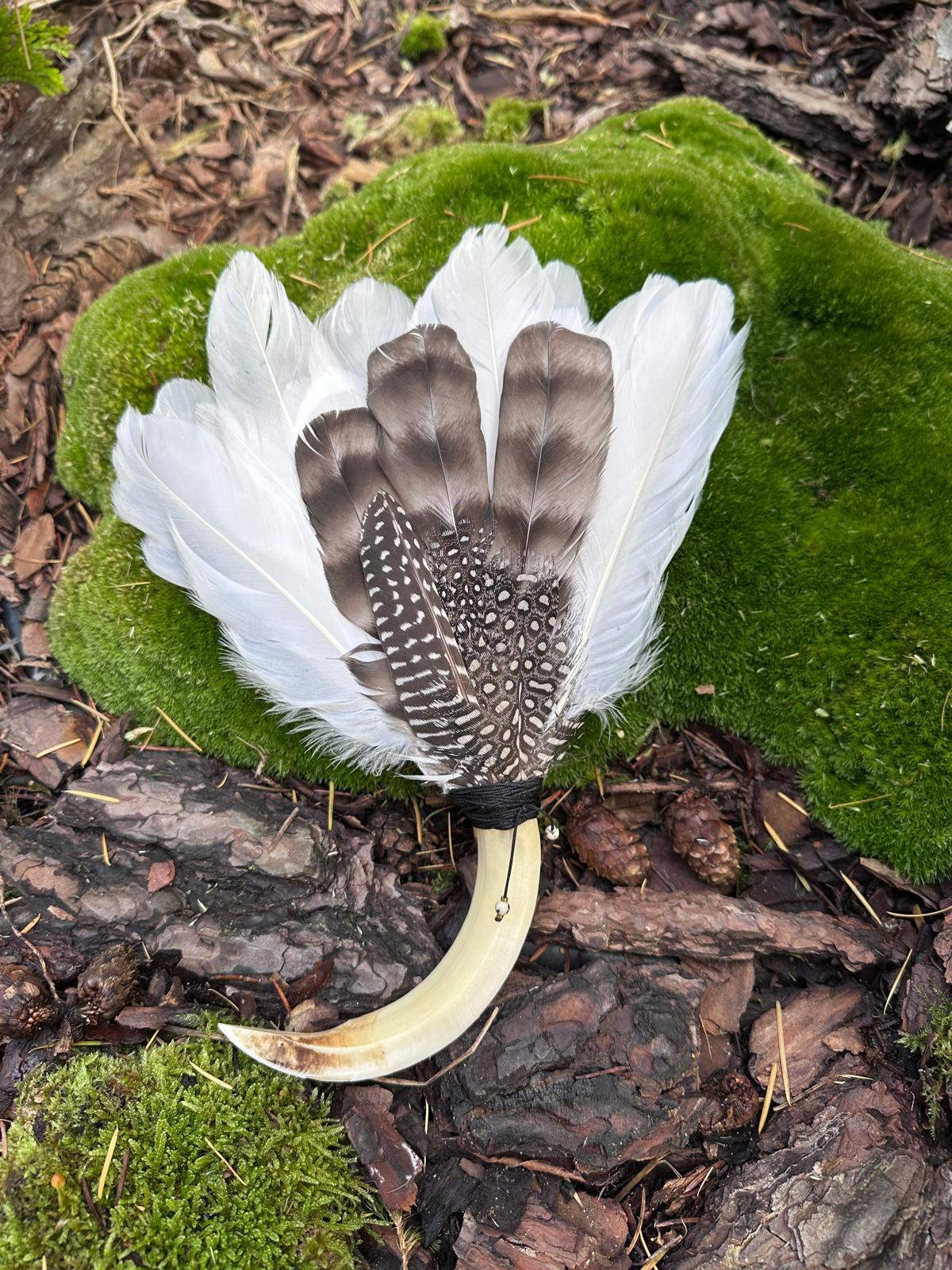 Różdżka ceremonialna -Kieł Dzika z białymi piórami