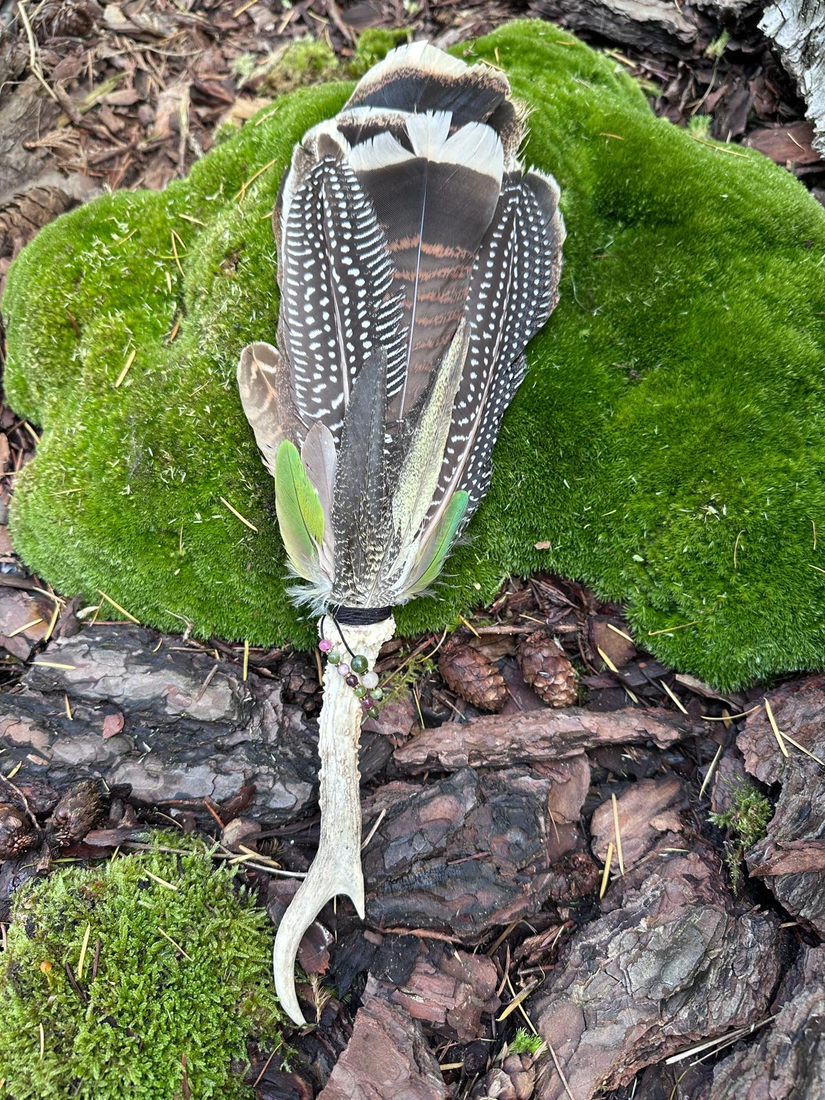 Ta ceremonialna różdżka z piór powstała z pełną uważnością i intencją, aby wspierać Twoją duchową drogę i codzienną praktykę serca.