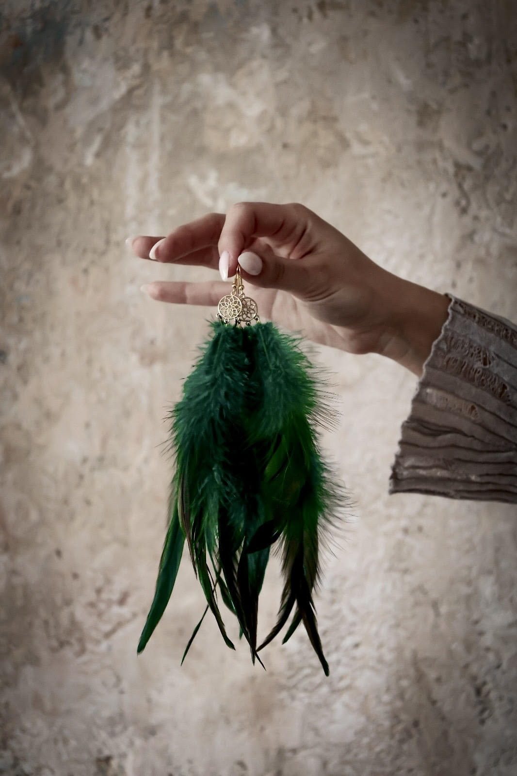 Zielone Kolczyki z piór "Skrzydła Bogini" Zmysłowa długość (średnie)